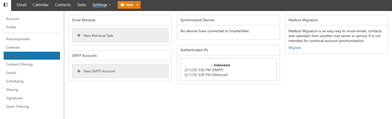 Connectivity Settings let you pull email from external mail accounts directly into SmarterMail. This is useful if you’re migrating from another email provider, or if you want to consolidate multiple inboxes into one place without logging in and out of different services.