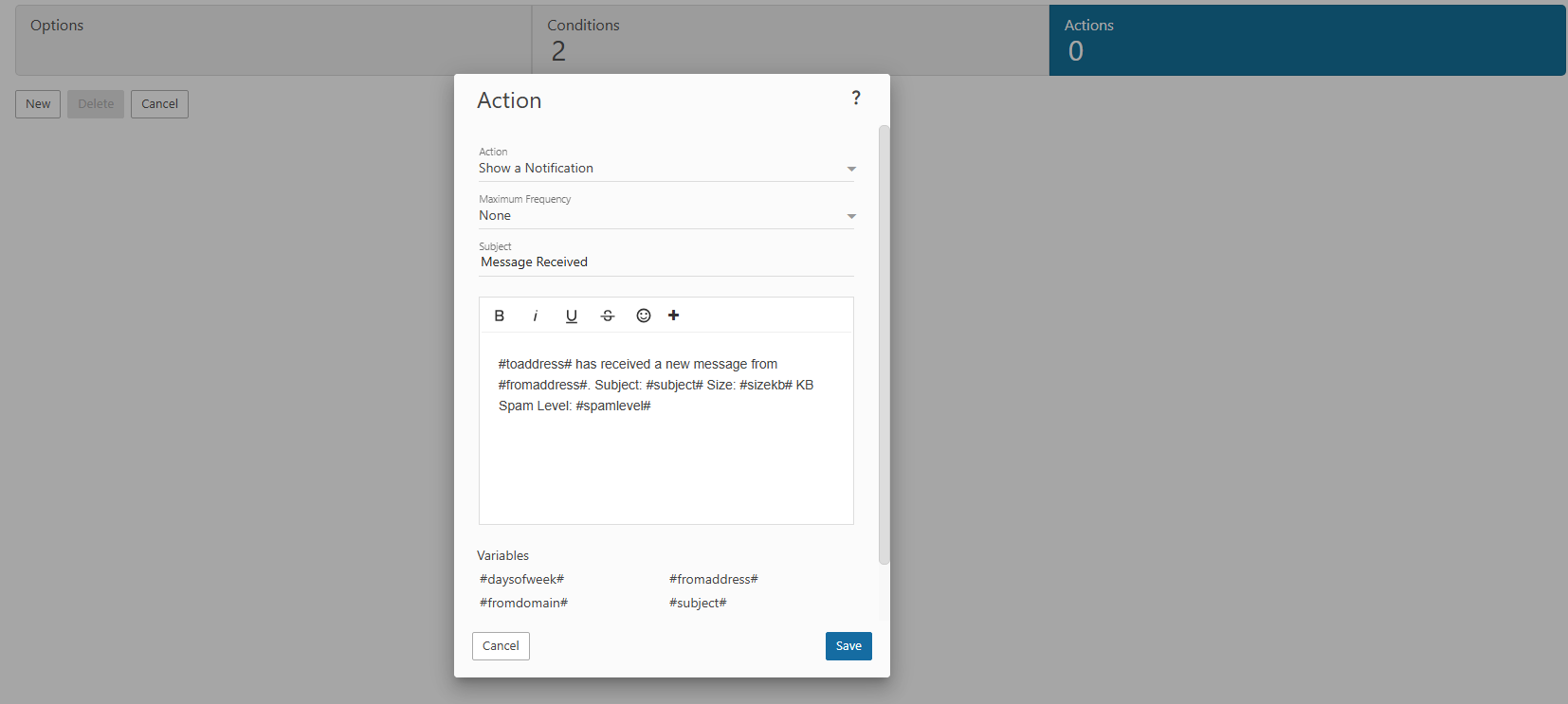 Switch to the Actions tab to define what happens when your conditions are met. Available actions include: