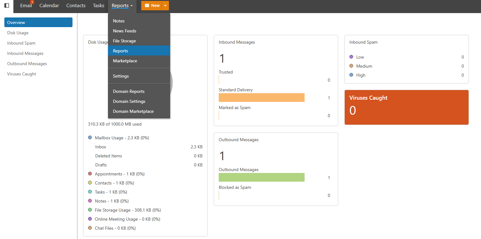 Reports give you visibility into the activity happening across your mail account. They provide statistics on disk usage, inbound and outbound messages, inbound spam caught, and viruses detected. It’s useful for spotting unusual activity, tracking mail volume trends, or just keeping an eye on your account’s health.