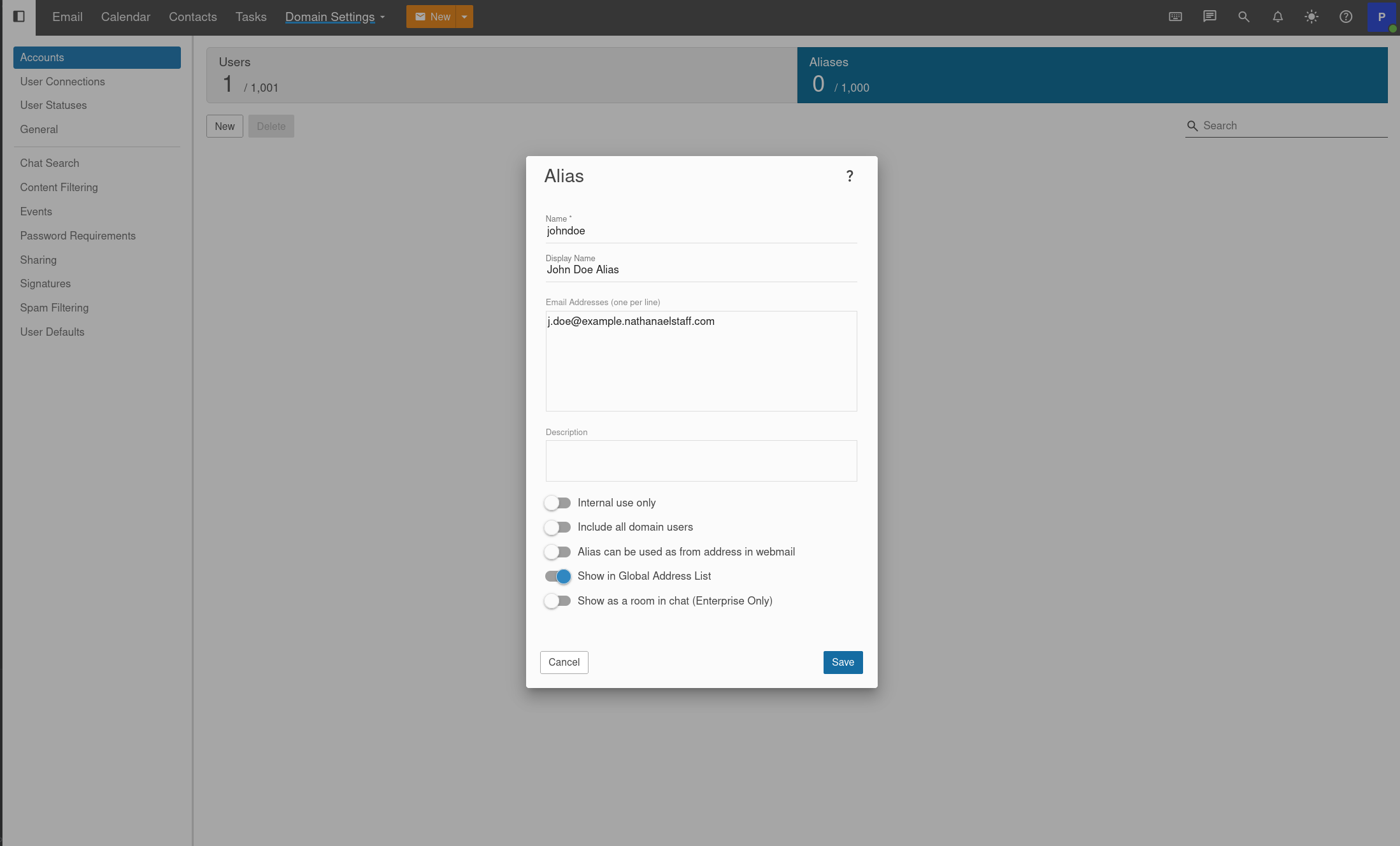 Show in Global Address List Make this alias visible in the Global Address List. Enterprise feature (which you have at Nathanael LLC).