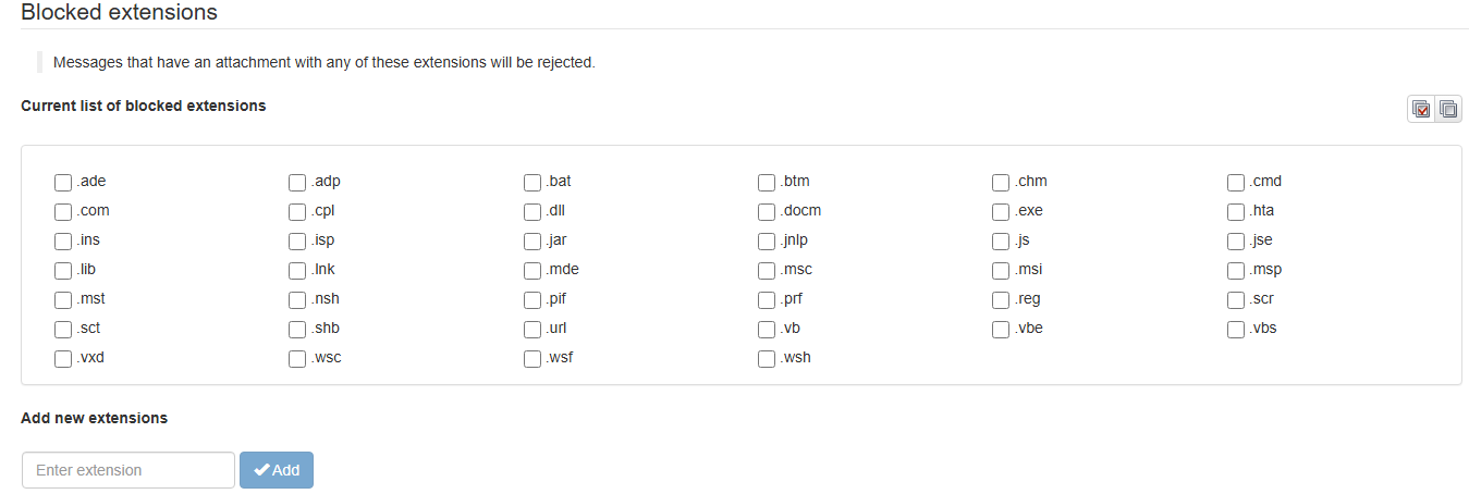 SpamExperts ships with pre-configured dangerous extensions already blocked. Here’s what you’re getting out of the box: