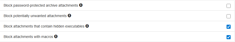 Password-Protected Archives Blocks messages with encrypted attachments like password-protected ZIP files. These are sneaky, can’t scan inside, so they get rejected.