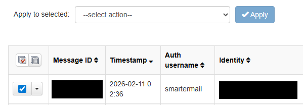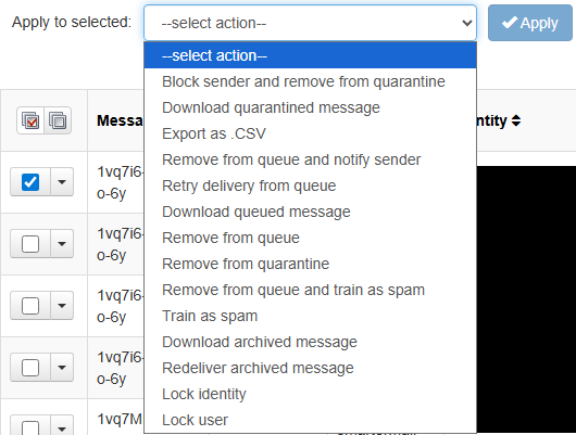 Select the action you want (Release, Delete, Whitelist, Blacklist, etc.) and click Apply to execute it on the selected messages.